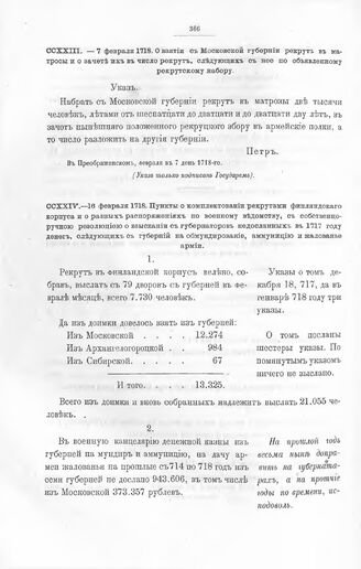 Высочайшие указы и повеления Императора Петра I, данные правительствующему сенату. О взятии с Московской губернии рекрут в матросы и о зачете их в число рекрут, следующих с нее по объявленному рекрутскому набору. В Преображенском, февраля в 7 день 1718-го // Из архива правительствующего сената.