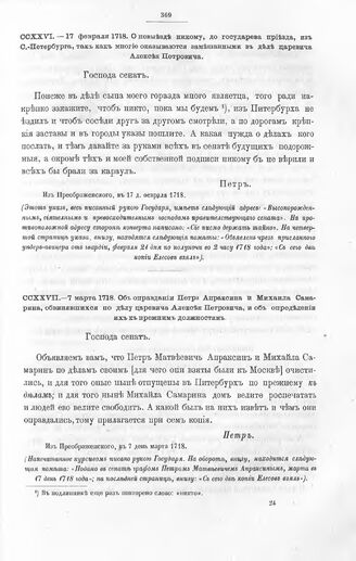 Высочайшие указы и повеления Императора Петра I, данные правительствующему сенату. Об оправдании Петра Апраксина и Михаила Самарина, обвинявшихся по делу царевича Алексея Петровича, и об определении их к прежним должностям. Из Преображенского, в 7 день марта 1718 // Из архива правительствующего сената.