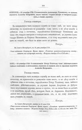 Высочайшие указы и повеления Императора Петра I, данные правительствующему сенату. О пожаловании Петру Толстому чина действительного тайного советника и нескольких деревень за привоз из-за границы царевича Алексея Петровича. В Санкт-Питербурхе, декабря в 13 день 1718 // Из архива правительствующего сената.