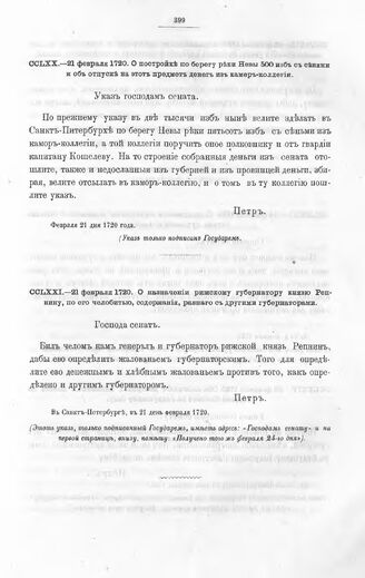 Высочайшие указы и повеления Императора Петра I, данные правительствующему сенату. О назначении рижскому губернатору князю Репнину, по его челобитью, содержания, равного с другими губернаторами. В Санкт-Петербурге, в 21 день февраля 1720 // Из архива правительствующего сената.