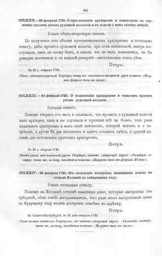 Высочайшие указы и повеления Императора Петра I, данные правительствующему сенату. О приглашении архиереев и сенаторов к слушанью проекта устава духовной коллегии и к подаче о нем своих мнений. В 23 д. февраля 1720 // Из архива правительствующего сената.