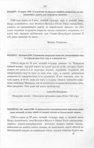 Высочайшие указы и повеления Императора Петра I, данные правительствующему сенату. О доставлении с.-петербургскими жителями, имеющими лошадей, по возу навоза с каждой лошади на Васильевский остров. 20 марта 1720 // Из архива правительствующего сената.