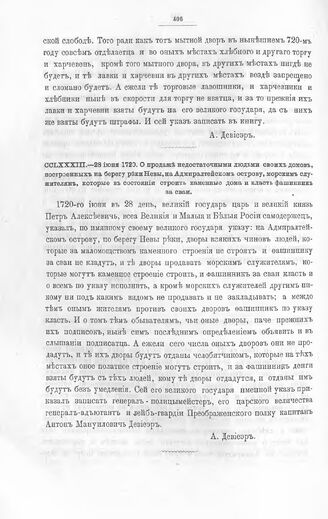 Высочайшие указы и повеления Императора Петра I, данные правительствующему сенату. О продаже недостаточными людьми своих домов, построенных на берегу реки Невы, на Адмиралтейском острове, морским служителям, которые в состоянии строить каменные дома и класть фашинник за сваи. 28 июня 1720 // Из архива правительствующего сената.