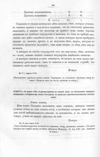 Высочайшие указы и повеления Императора Петра I, данные правительствующему сенату. О рассмотрении в сенате дела по обвинению бывшего сибирского губернатора князя Гагарина в разных противозаконных поступках. В 11 день марта 1721 // Из архива правительствующего сената.