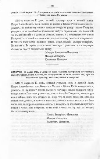 Высочайшие указы и повеления Императора Петра I, данные правительствующему сенату. О допросе и пытании в застенке бывшего сибирского губернатора князя Гагарина. 11 марта 1721 // Из архива правительствующего сената.