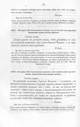 Высочайшие указы и повеления Императора Петра I, данные правительствующему сенату. О заготовлении провианта и об отпуске денег для плотников, назначаемых на казенные работы. Из Риги, в 28 день апреля 1721 // Из архива правительствующего сената.
