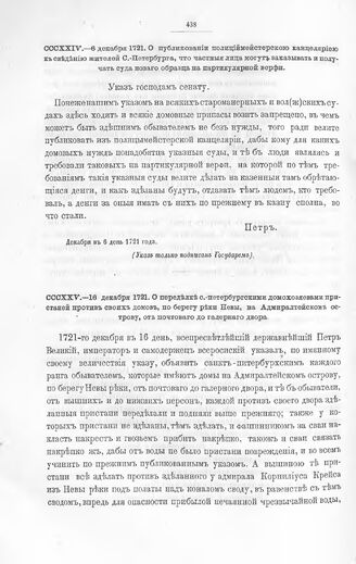 Высочайшие указы и повеления Императора Петра I, данные правительствующему сенату. О переделке с.-петербургскими домохозяевами пристаней против своих домов, по берегу реки Невы, на Адмиралтейском острове, от почтового до галерного двора. 16 декабря 1721 // Из архива правительствующего сената.