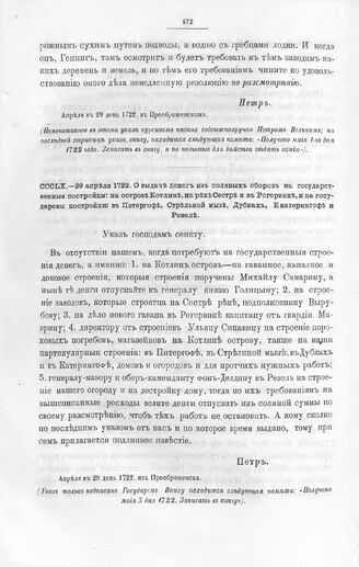 Высочайшие указы и повеления Императора Петра I, данные правительствующему сенату. О выдаче денег из соляных сборов на государственные постройки: на острове Котлине, на реке Сестре и в Рогервике, и на государевы постройки: в Петергофе, Стрельной м...