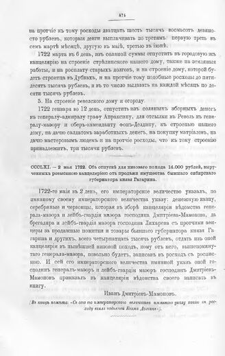 Высочайшие указы и повеления Императора Петра I, данные правительствующему сенату. Об отпуске для низового похода 14.000 рублей, вырученных розыскной канцелярией от продажи имущества бывшего сибирского губернатора князя Гагарина. 2 мая 1722 // Из архива правительствующего сената.