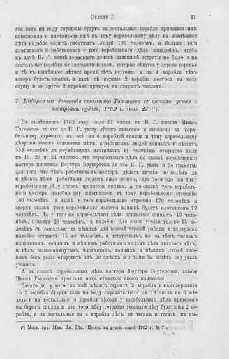 Выборка из донесения стольника Татищева с сясского устья о постройке судов, 1702 г. июля 27 // Моск. арх. Мин. Ин. Дел. (Переп. на русск. языке 1702 г. № 7).