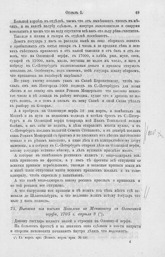 Выписка из письма Яковлева к Меншикову с Олонецкой верфи, 1705 г. апреля 9 // Гл. морск. арх. (Воинск. морск. прик. № 59).