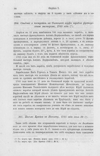 Сведение о постройке на Олонецкой верфи корабля французским мастером, 1705 года // Гл. морск. арх. (Воинск. морск. прик. 1705 г. № 5.)