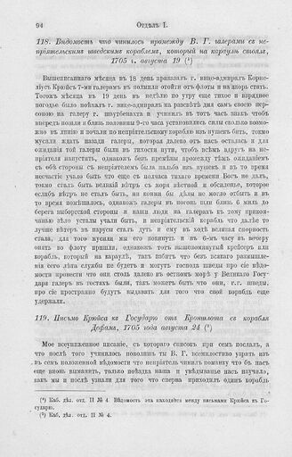 Ведомость что чинилось промежду В. Г. галерами с неприятельским шведским кораблем, который на карауле стоял, 1705 г. августа 19 // Каб. дел. отд. II № 4.