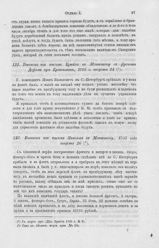 Выписка из письма Крюйса к Меншикову с фрегата Дефам при Кроншлоте, 1705 г. августа 24 // Гл. морск. арх. (Дел. Крюйса 1705 г. № 2).