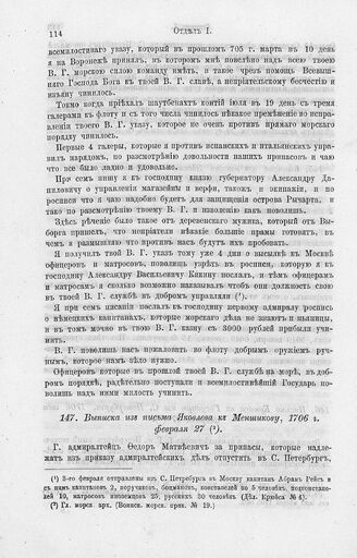 Выписка из письма Яковлева к Меншикову, 1706 г. февраля 27 // Гл. морск. арх. (Воинск. морск. прик. № 19.)