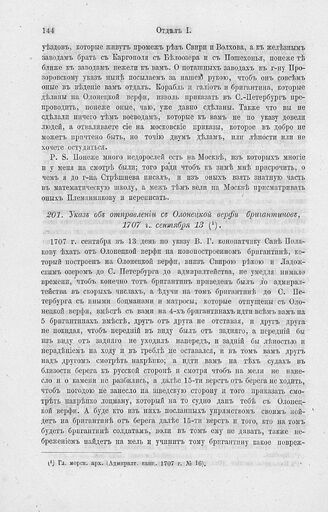 Указ об отправлении с Олонецкой верфи бригантинов, 1707 г., сентября 13 // Гл. морск. арх. (Адмиралт. канц., 1707 г. № 16).