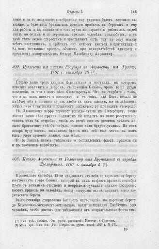 Извлечение из письма Государя к Апраксину из Гродно, 1707 г. сентября 18 // Имп. публ. библиот. (Отд. русск. рукописей).