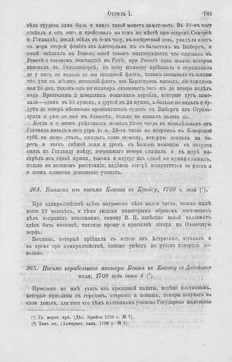 Выписка из письма Кикина к Крюйсу, 1709 г. май // Гл. морск. арх. (Дел. Крюйса 1709 г. № 7).