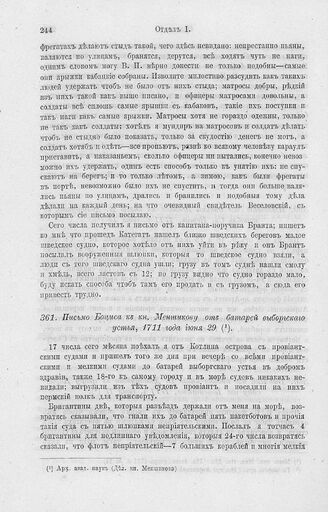 Письмо Боциса к кн. Меншикову от батарей выборгского устья, 1711 года июня 29 // Арх. акад. наук (Дел. кн. Меншикова).