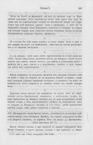 Инструкция командгирам судов, находящихся в эскадре под начальством вице-адмирала Крюйса, на случай вступления в бой или якорной стоянки, с корабля Рига на якоре у Кроншлота, 1712 года июля 23 // Гл. морск. арх. (Сборн. инструкций, 1704—1726).