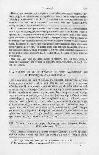 Выписка из письма Государя к князю Меншикову, из С. Петербурга, 1713 года июля 27 // Моск. арх. Мин. Ин. Дел. (Дел. кн. Меншикова, 1712 г. № 5).