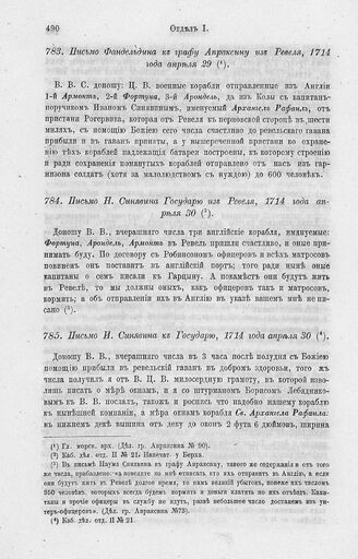 Письмо Н. Синявина Государю из Ревеля, 1714 года апреля 30 // Каб. дел. отд. II № 21.