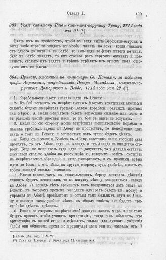 Приказ, отданный на полугалере Св. Наталия, за подписью графа Апраксина, шаутбенахта Петра Михайлова, генерал-поручиков Долгорукова и Вейде, 1714 года мая 22 // Каб. дел. отд. II № 22.