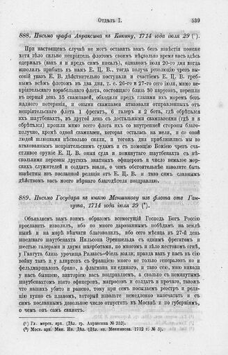Письмо Государя к князю Меншикову из флота от Гангута, 1714 года июля 29 // Моск. арх. Мин. Ин. Дел. (Дел. кп. Меншикова. 1712 г. № 5).