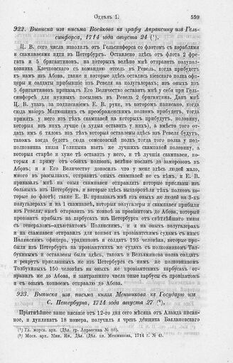 Выписка из письма Воейкова к графу Апраксину из Гельсинфорса, 1714 года августа 24 // Гл. морск. арх. (Дел. гр. Апраксина № 88).