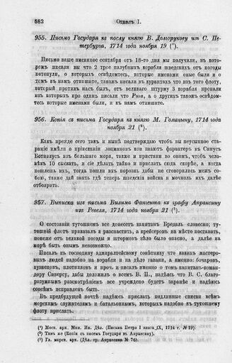 Копия с письма Государя к князю М. Голицыну, 1714 года ноября 21 // Моск. арх. Мин. Ин. Дел. (Копии с писем Государя к Апраксину).