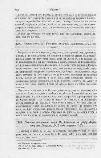 Письмо князя М. Голицына к графу Апраксину, 1715 года июль // Гл. морск. арх. (Дел. гр. Апраксина № 94).