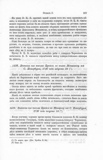 Выписка из письма Крюйса, к князю Меншикову из С. Петербурга, 1716 года августа 24 // Гл. морск. арх. (Дел. Крюйса № 24).