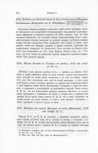 Выписка из донесения барона де Би Генеральным Штатам Соединенных Нидерланд из С. Петербурга, 1716 года декабря 20/1711 года января 1 // Нидерланд. государств. арх. в Гаге. Копия находится в Императ. академии наук.