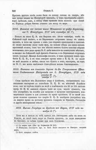 Выписка из письма князя Меншикова к графу Апраксину, из С. Петербурга, 1717 года сентября 26 // Гл. морск. арх. (Дел. гр. Апраксина № 141).
