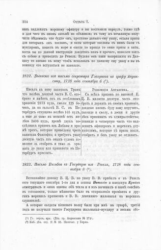 Выписка из письма секретаря Глазунова к графу Апраксину, 1718 года сентября 6 // Гл. морск. арх. (Дел. гр. Апраксина № 174).