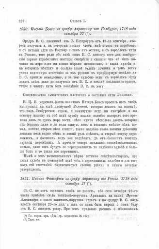 Письмо Бенса к графу Апраксину из Гамбурга, 1718 года октября 27 // Гл. морск. арх. (Дел. гр. Апраксина № 163).