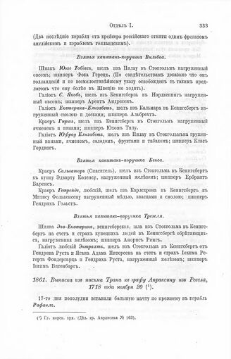 Выписка из письма Трана к графу Апраксину из Ревеля, 1718 года ноября 20 // Гл. морск. арх. (Дел. гр. Апраксина № 163).