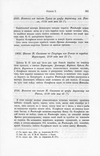 Письмо Н. Синявина к Государю из Ревеля с корабля Портсмут, 1719 года мая 13 // Каб. дел. отд. II № 42.
