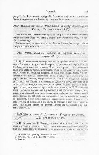 Выписка из письма Фандельдина к графу Апраксину из Ревеля, 1720 года апреля 25 // Гл. морск. арх. (Дел. гр. Апраксина № 191).