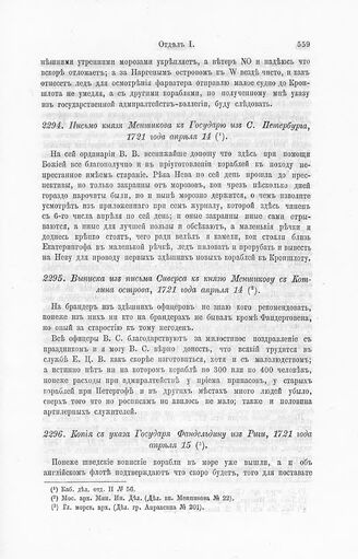 Выписка из письма Сиверса к князю Меншикову с Котлина острова, 1721 года апреля 14 // Моск. арх. Мин. Ин. Дел. (Дел. кн. Меншикова № 22).
