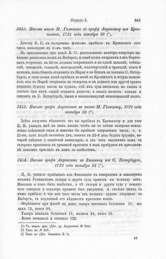 Письмо князя М. Голицына к графу Апраксину из Кроншлота, 1721 года октября 20 // Гл. морск. арх. (Дел. гр. Апраксина № 200).