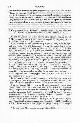 Сведения о мастерах, мастеровых и рабочих людях, 1703-1724. Указ сената князю Меншикову о наряде людей для постройки при С. Петербурге 200 бригантинов, 1711 года сентября 21 // Гл. морск. арх. (Дел. адмиралт. канцелярии 1712 г. № 13).