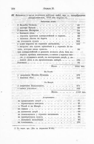 Сведения о мастерах, мастеровых и рабочих людях, 1703-1724. Ведомость о числе наличных рабочих людей при с. петербургском адмиралтействе, 1713 года август // Гл. морск. арх. (Дел. гр. Апраксина № 61).