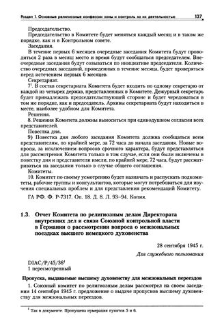 Отчет Комитета по религиозным делам Директората внутренних дел и связи Союзной контрольной власти в Германии о рассмотрении вопроса о межзональных поездках высшего немецкого духовенства. 28 сентября 1945 г. // ГА РФ. Ф. Р-7317. Оп. 18. Д. 9. Л. 133-134. Копия.