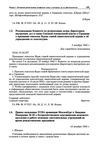 Рекомендация Комитета по религиозным делам Директората внутренних дел и связи Союзной контрольной власти в Германии о признании епископа Вурма главой евангелической церкви и об упразднении ее конституции. 3 декабря 1945 г. // ГА РФ. Ф. Р-7317. Оп. 18. Д. И. Л. 30. Копия.