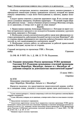 Указание начальника Отдела пропаганды УСВА провинции Саксония Н.С. Родионова начальникам отделений пропаганды округов Мерзебург, Магдебург, Ангальт и г. Магдебург об усилении контроля за деятельностью евангелической церкви. 13 июня 1946 г.