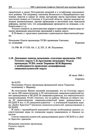 Докладная записка начальника отделения пропаганды УКС Готского округа С.Б. Арустамова начальнику Отдела пропаганды УСВА земли Тюрингия М.М. Варакину о необходимости проведения денацификации священнослужителей округа. 28 июня 1946 г.