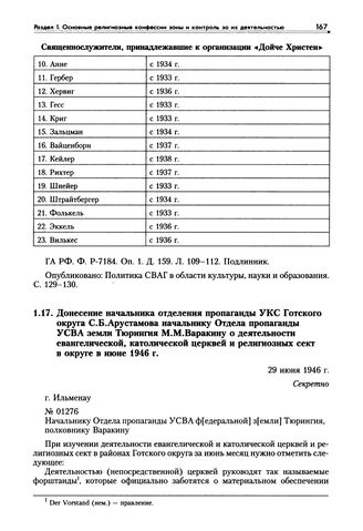 Донесение начальника отделения пропаганды УКС Готского округа С.Б. Арустамова начальнику Отдела пропаганды УСВА земли Тюрингия М.М. Варакину о деятельности евангелической, католической церквей и религиозных сект в округе в июне 1946 г. 29 июня 1946 г. // ГА РФ. Ф. Р-7184. Оп. 1. Д. 159. Л. 113-115. Подлинник. Опубликовано: Политика СВАГ в области культуры, науки и образования. С. 130-132.
