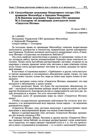 Спецсообщение начальника Оперативного сектора СВА провинции Мекленбург и Западная Померания Д.М. Никитина начальнику Управления СВА провинции М.А. Скосыреву об активизации деятельности секты «Свидетели Иеговы». 22 июля 1946 г.