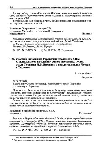 Указание начальника Управления пропаганды СВАГ С.И. Тюльпанова начальнику Отдела пропаганды УСВА земли Тюрингия М.М. Варакину о праздновании дня Лютера в Тюрингии. 31 июля 1946 г. // ГА РФ. Ф. Р-7184. Оп. 1. Д. 159. Л. 107. Подлинник.